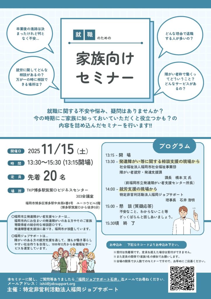 11/15(土)13:30から、主に大学や専門学校等に在学中のお子さんがおられるご家族を対象にした「就職のための 家族向けセミナー」を行います。